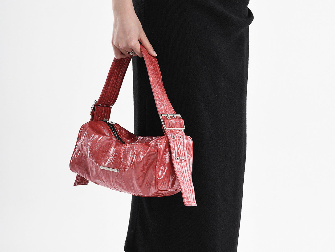 The mini duffles come in patent vegan leather and beaded faux suede, adding structure and edge, with a compact shape and a secure zipped closure.